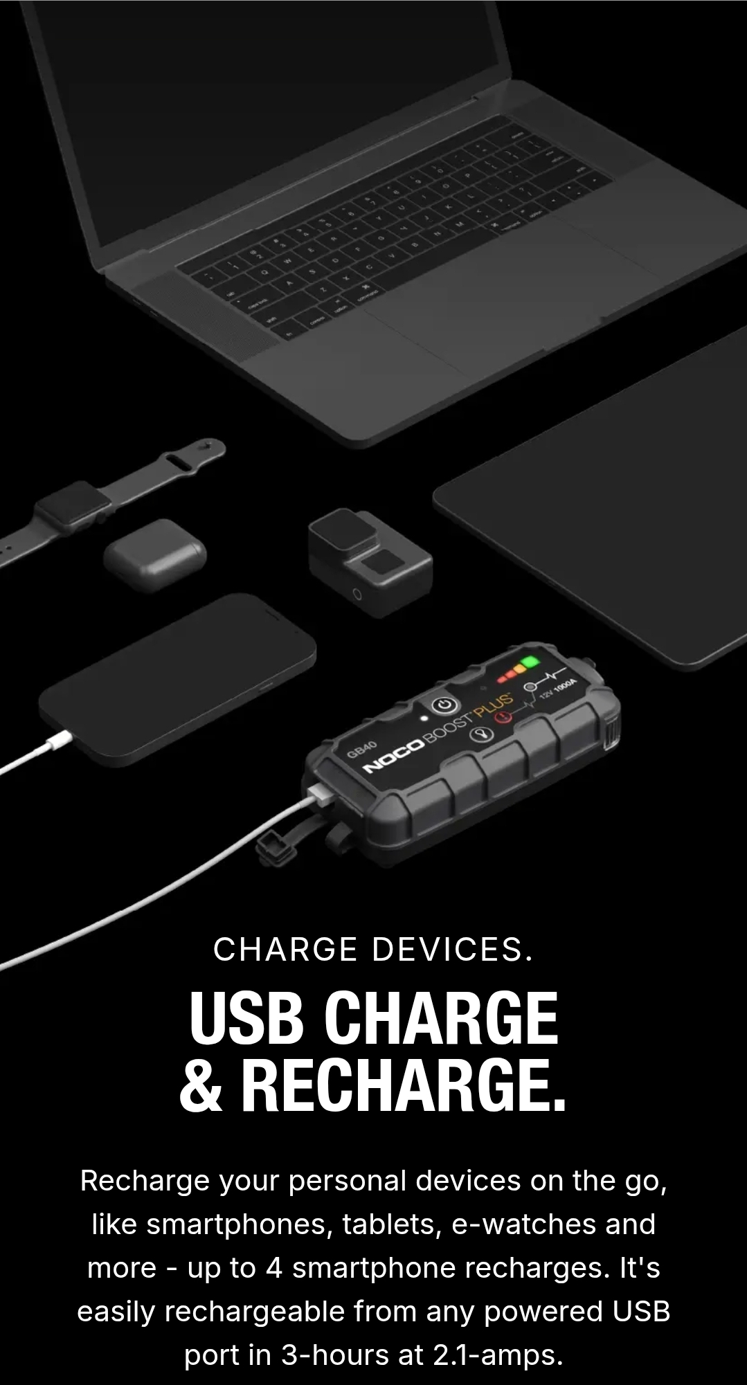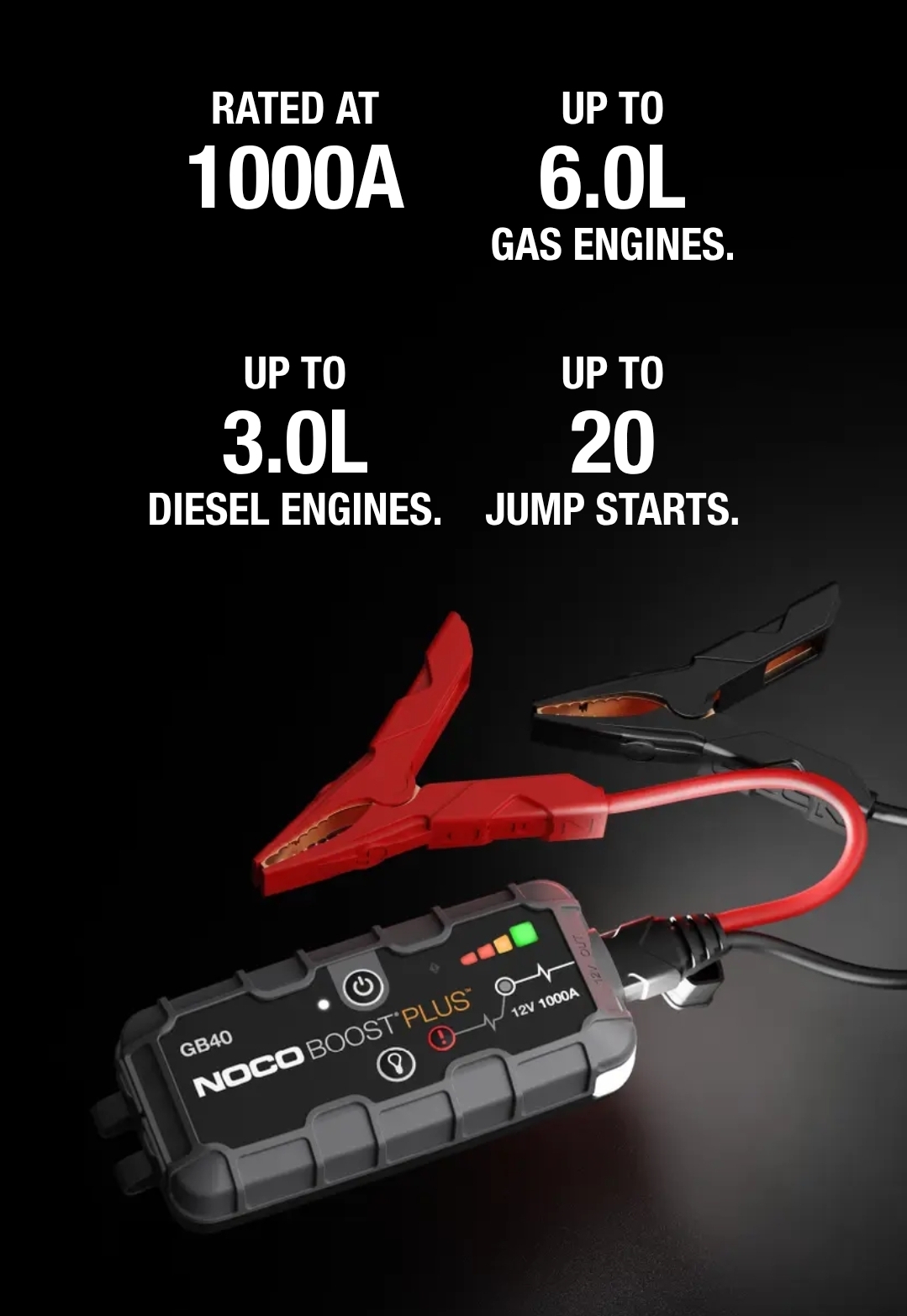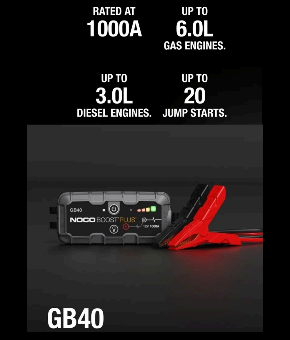The GB40 is a portable lithium-ion battery jump starter pack that delivers 1,000-amps for jump starting a dead battery in seconds. It features a patented safety technology that provides spark-proof connections and reverse polarity protection making safe and easy for anyone to use. It’s a powerful battery booster that doubles as a portable power source for recharging USB devices, like a smartphone, tablet and more. Designed for a car, boat, RV, truck and more with gas engines up to 6 liters, and diesel engines up to 3 liters.