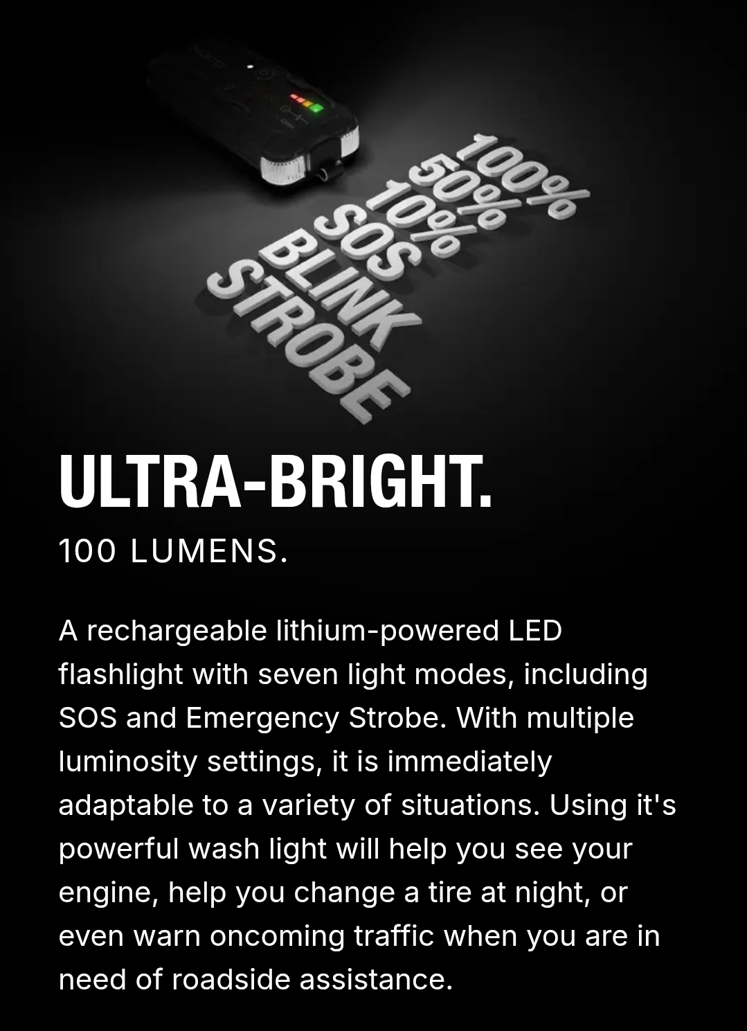 A rechargeable lithium-powered LED flashlight with seven light modes, including SOS and Emergency Strobe. With multiple luminosity settings, it is immediately adaptable to a variety of situations. Using it’s powerful wash light will help you see your engine, help you change a tire at night, or even warn oncoming traffic when you are in need of roadside assistance.