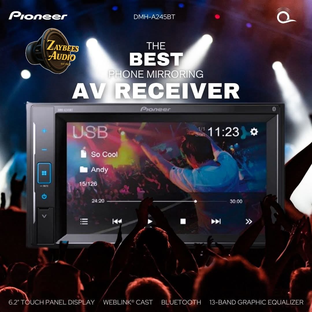 The Pioneer DMH-A245BT 6.2-inch Double Din AV Receiver is a multimedia hub designed for easy smartphone use and clear in-car entertainment. It supports WebLink Cast mirroring, Bluetooth, USB, and Aux-In, so you can stay connected and enjoy your favorite media on the road.