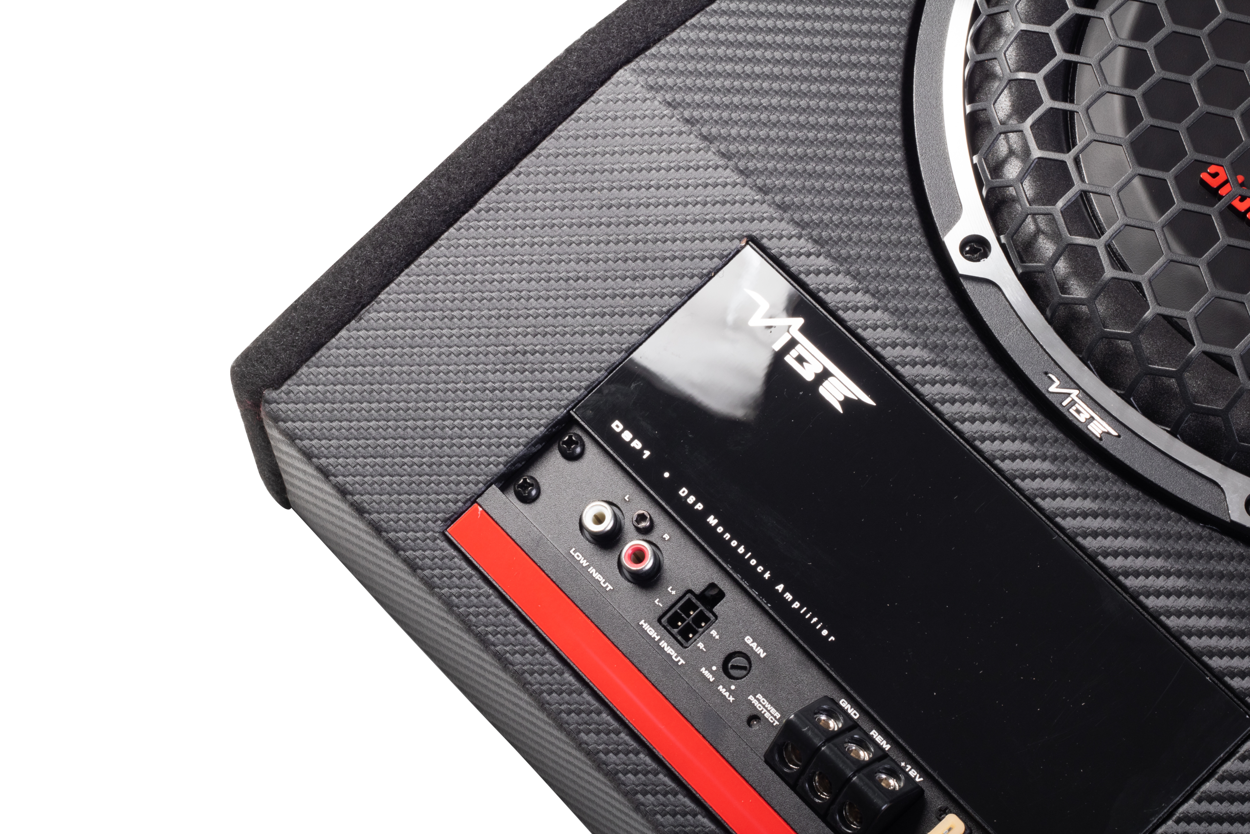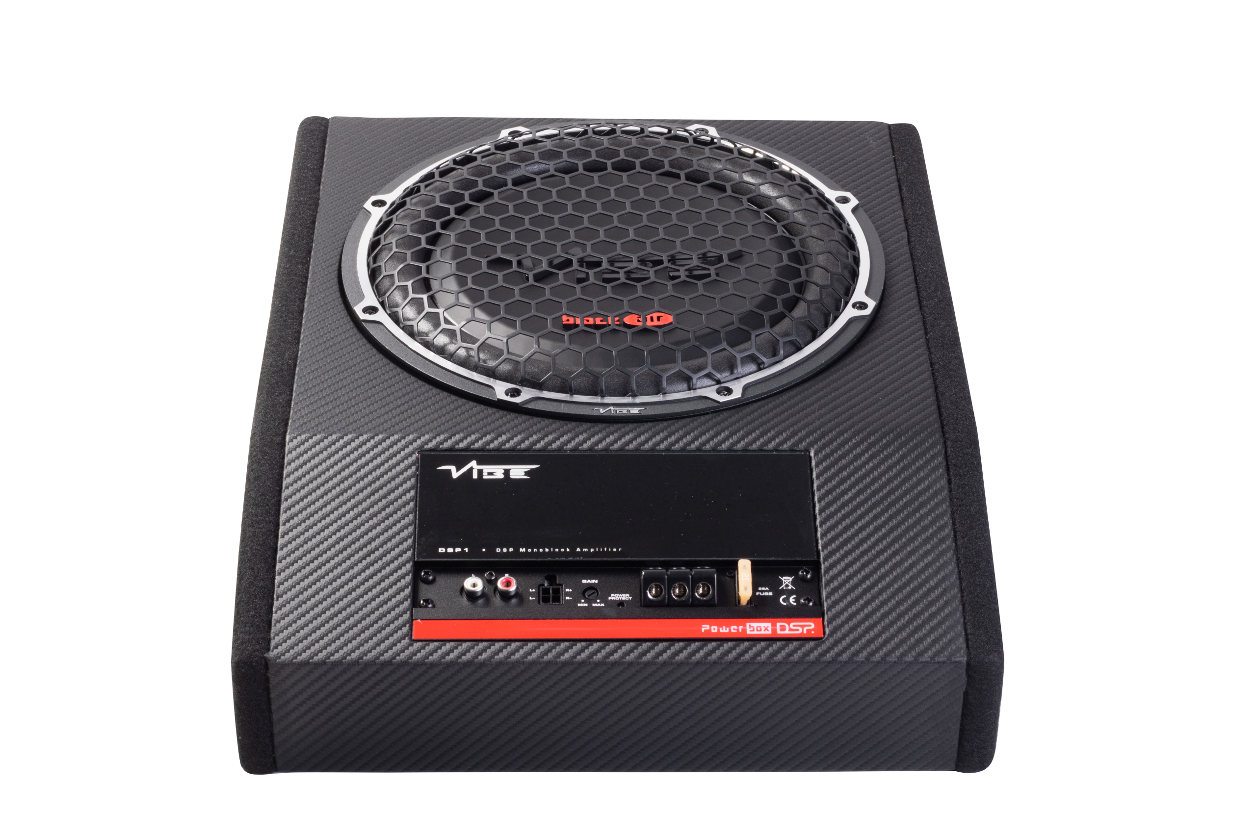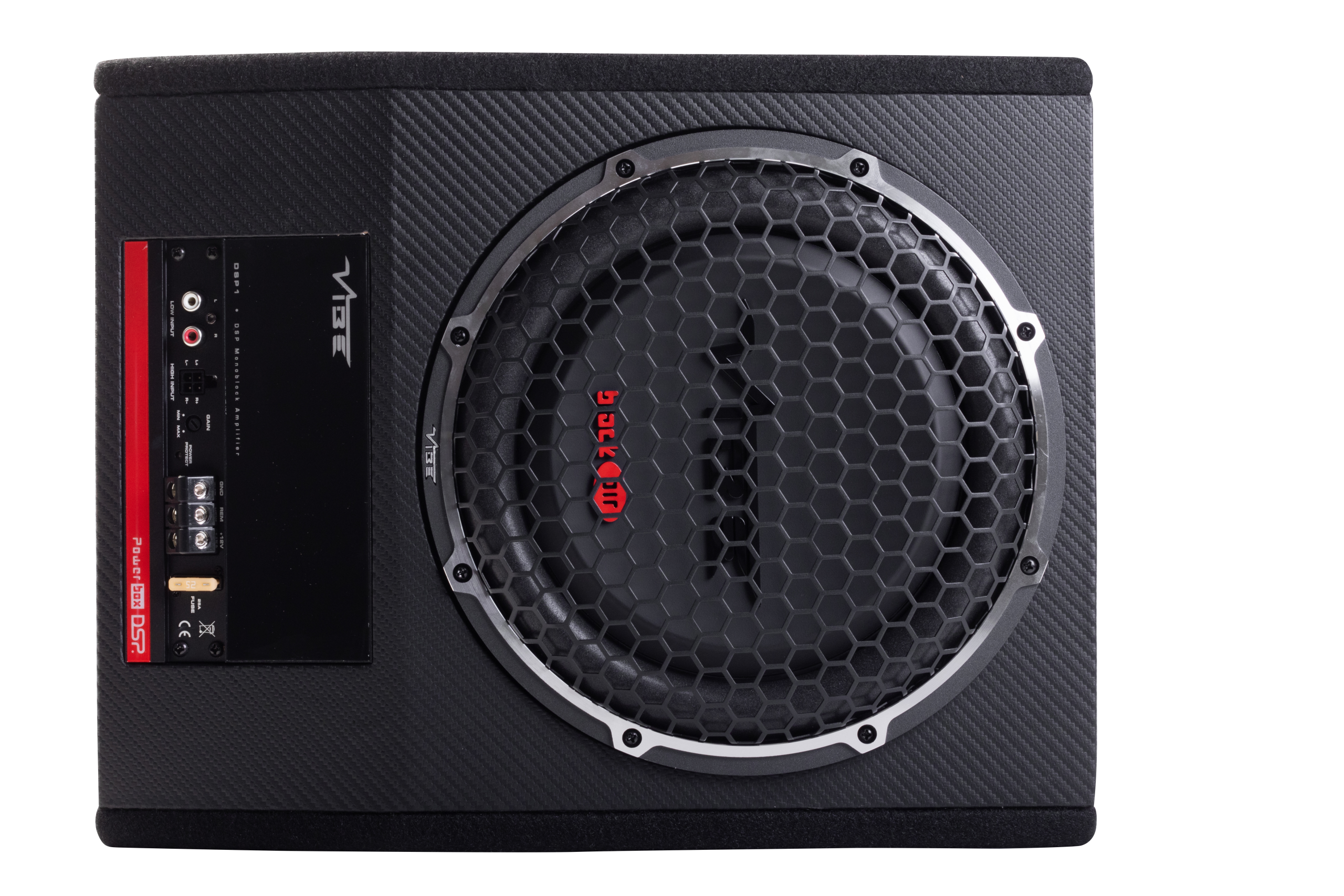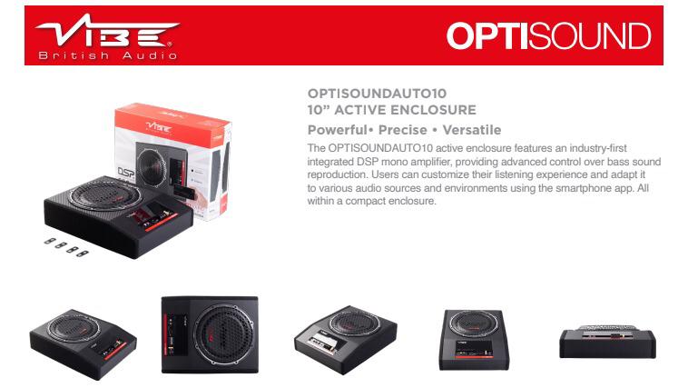VIBE Optisound AUTO10A-V4 underseat subwoofer. The “auto” in the name refers to its autosense feature, which allows it to power on when it detects a signal from a factory head unit.