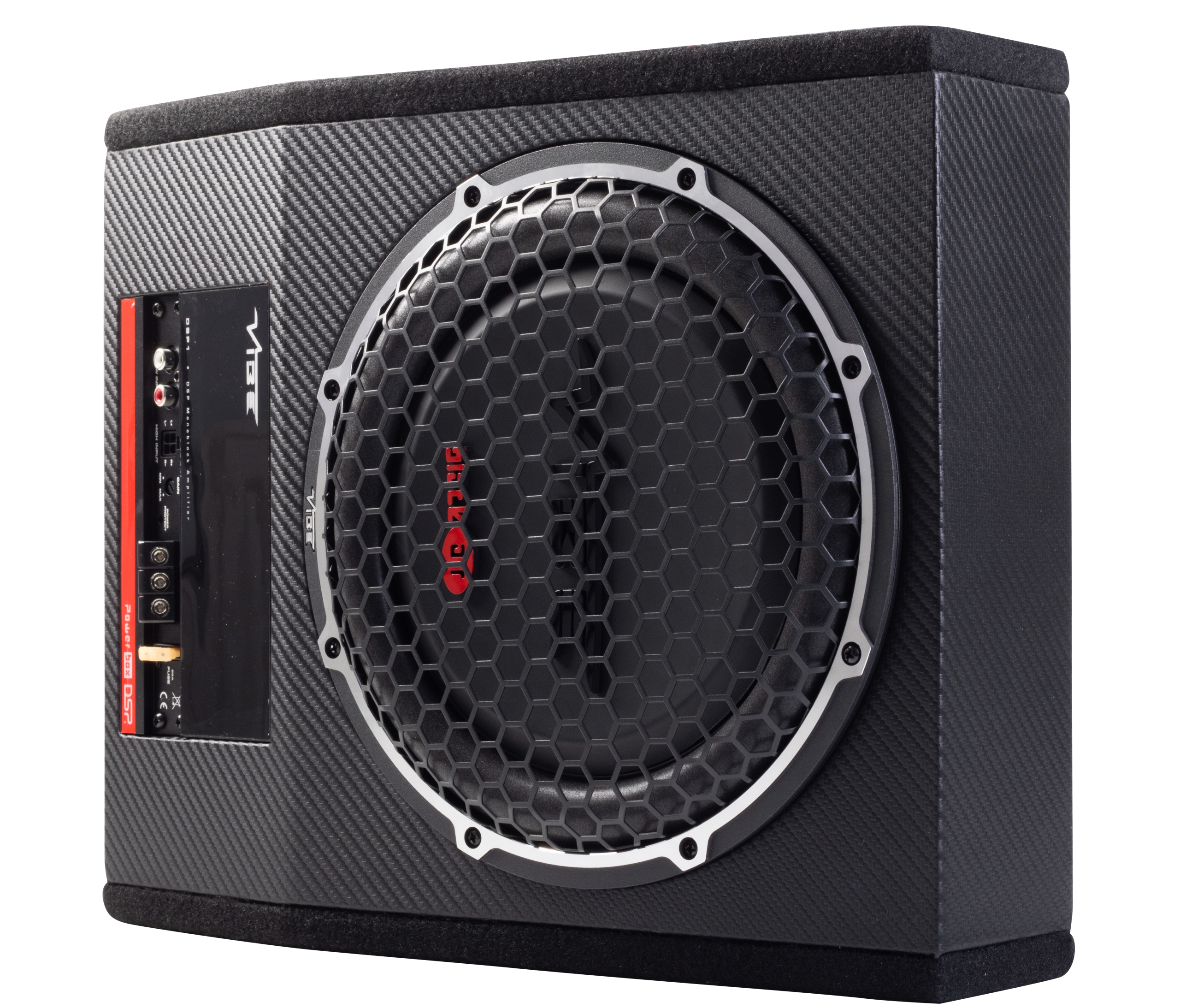 - Enclosure: Slim, sealed MDF housing with a hexagonal grille.