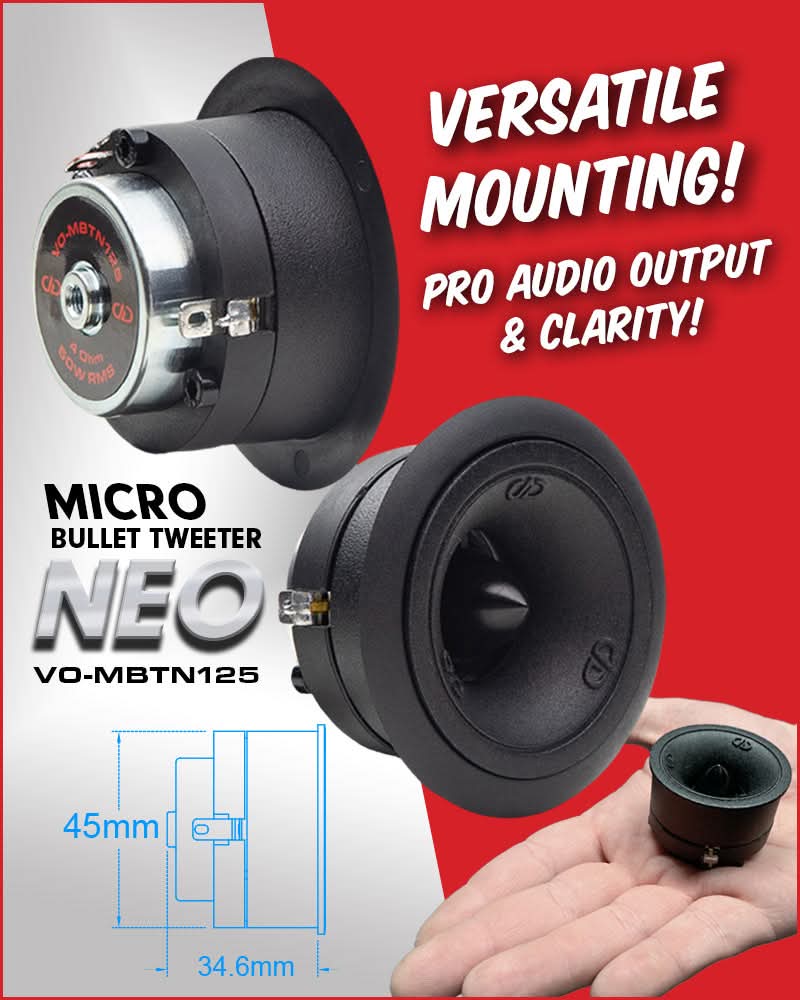 The Voice Optimized Micro Bullet Neo Tweeter was envisioned, designed and tooled by DD AUDIO to give installers more options and listeners greater satisfaction. This innovation is one of many additions to DD’s VO Series, expanding the power and application of these legendary pro audio speakers, and it won’t be the last.